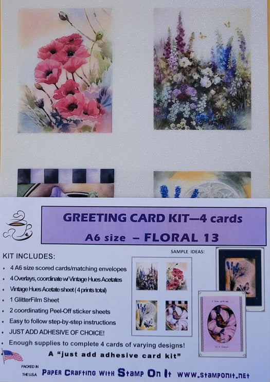 Our GlitterFilm & Vintage Hues 12 Card Kits contain all the products needed to complete 12 beautiful cards/or projects of varying design depending on the creator's imagination! In some cases you will have extra product left over depending on items used on each card/or project. each kit contains:12 cards/matching envelopes12 overlays that coordinate with the Vintage Hues designs used in the kit2-3 sheets of Vintage Hues (12 prints)3 sheets Peel-Off style stickers that will coordinate with the project2-3 sheets GlitterFilm(adhesive backed) enough to back Vintage Hue sheets encloseddetailed instructions from start to finish! THIS IS A JUST ADD ADHESIVE KIT!!! see samples below and check out our VIDEO section for the tutorial on our GlitterFilm & Vintage Hues 12 Card Kits!