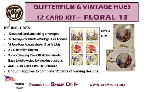 Our GlitterFilm & Vintage Hues 12 Card Kits contain all the products needed to complete 12 beautiful cards/or projects of varying design depending on the creator's imagination! In some cases you will have extra product left over depending on items used on each card/or project.